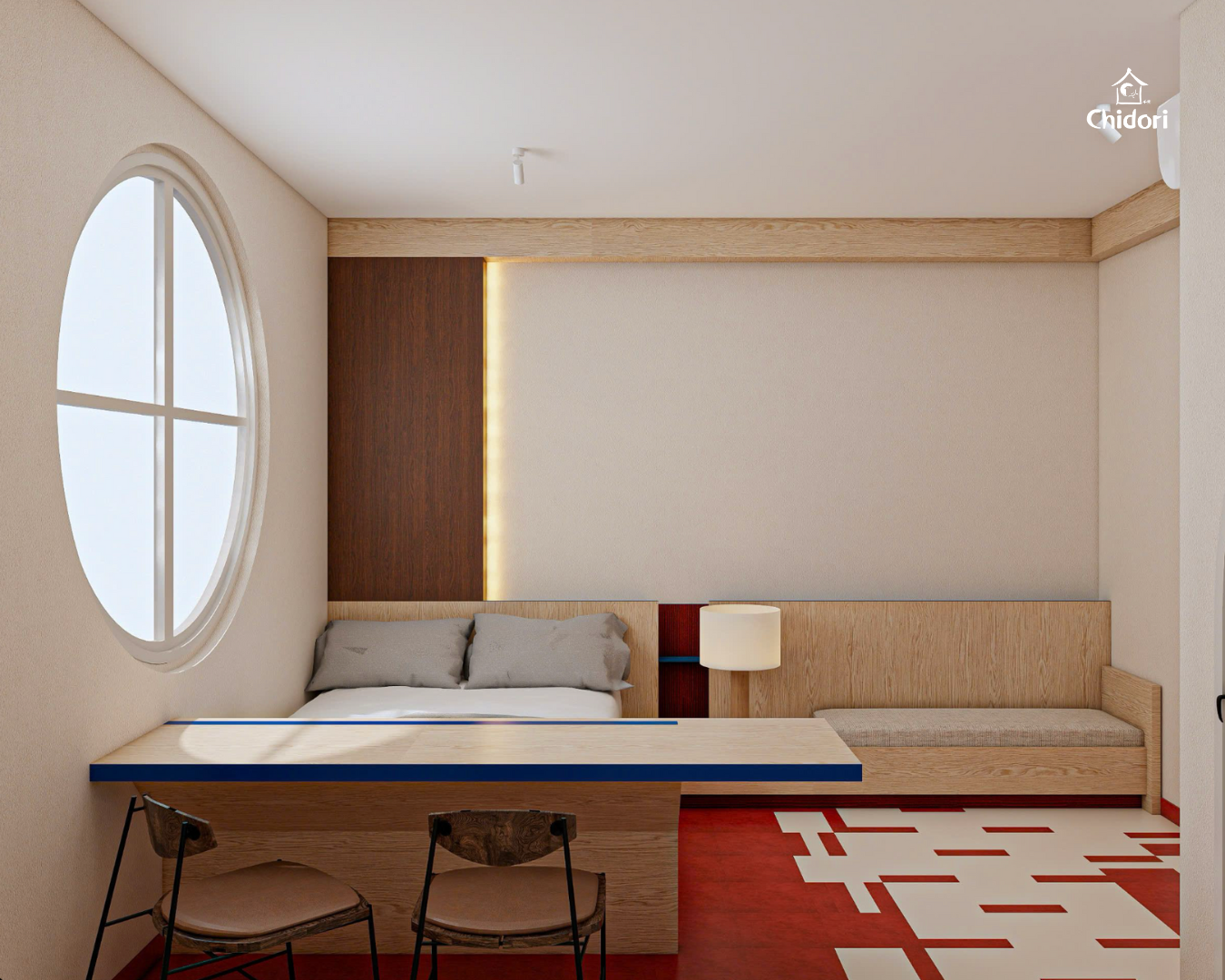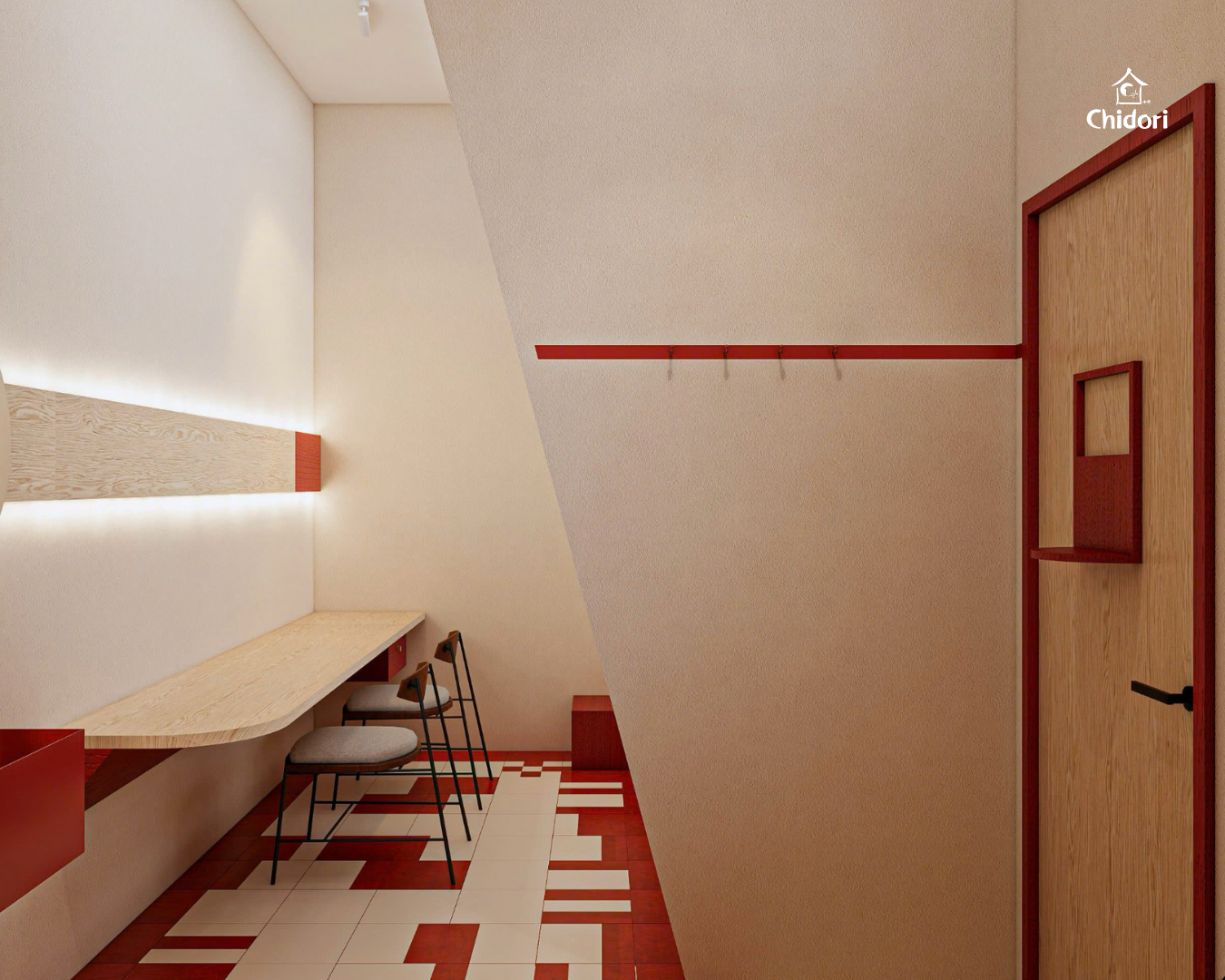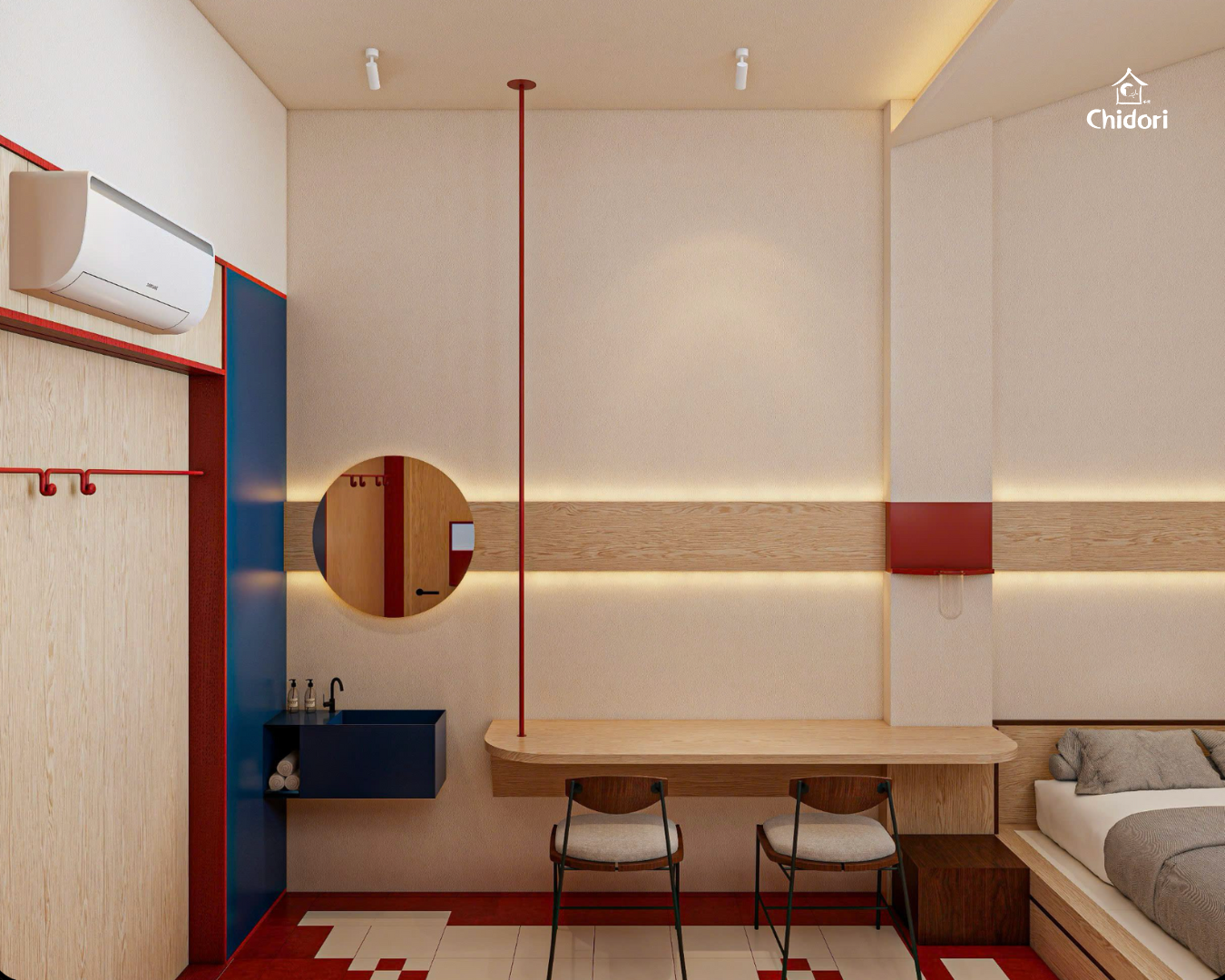 Lấy công năng làm trung tâm, phong cách thiết kế Bauhaus tại Chidori được thể hiện qua việc sử dụng các gam màu cơ bản (Primary Colors) - đỏ, xanh dương và vàng trên nền chất liệu gỗ để tạo nên tổng thể hiện đại, rõ ràng và có trật tự.