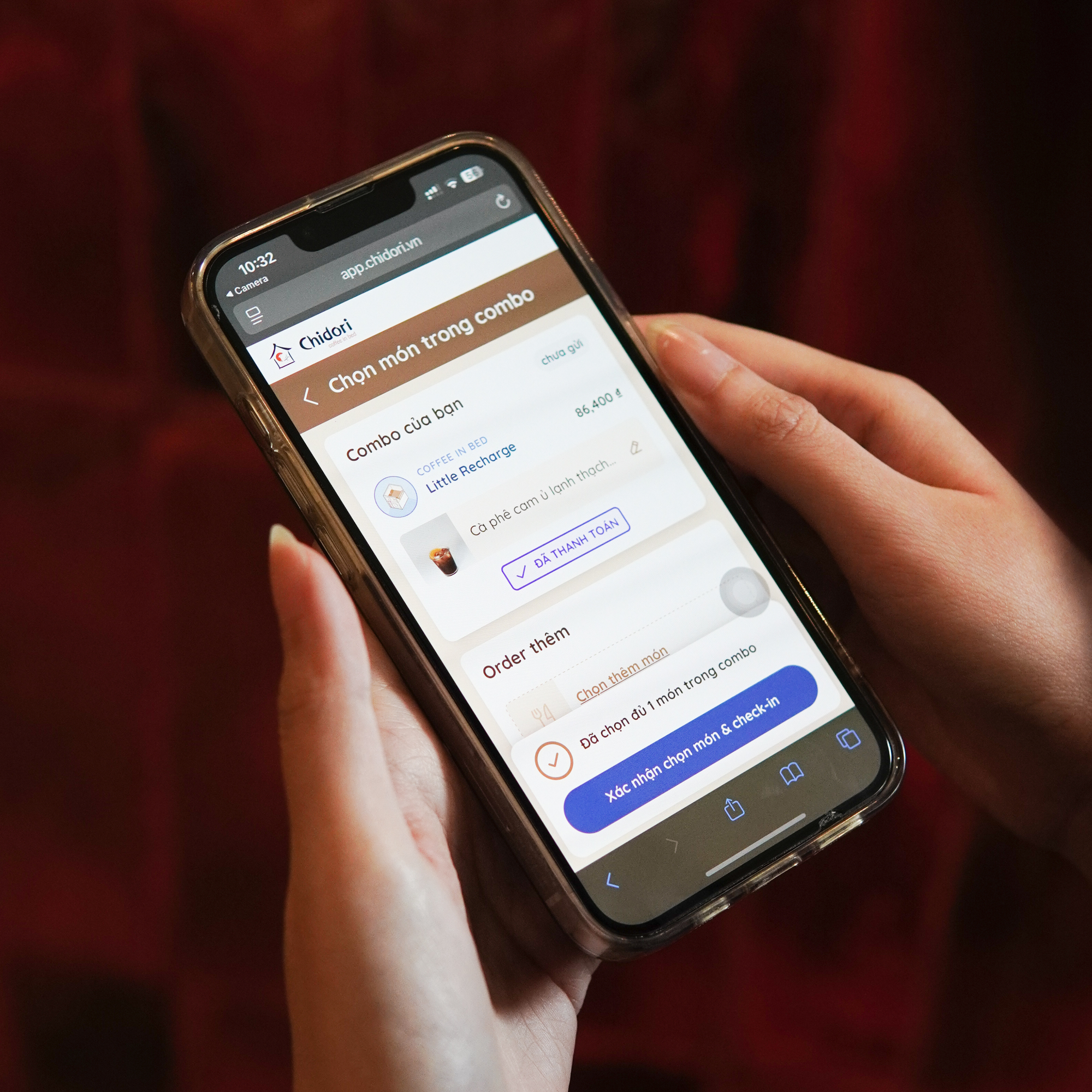 Với QR Self Check-in, bạn không phải bắt buộc gọi món tại quầy. Bạn có thể lựa chọn món trong quá trình check-in hoặc sau khi nhận bed, chỉ cần quét mã “đặt món” đã được bố trí sẵn trong mỗi không gian tại Chidori. Mọi lựa chọn đều nằm gọn trong vài thao tác trên điện thoại.